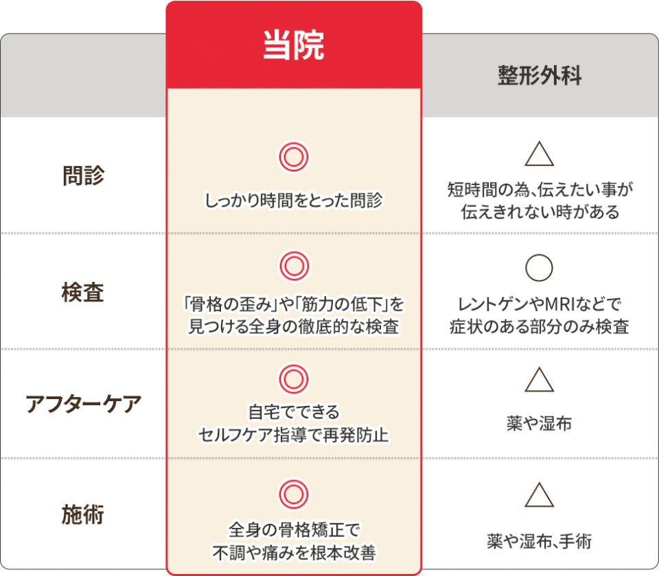 当院独自の全身の骨格矯正で不調や痛みを根本から改善し、自宅でできるセルフケアの指導で再発防止も目指します。
